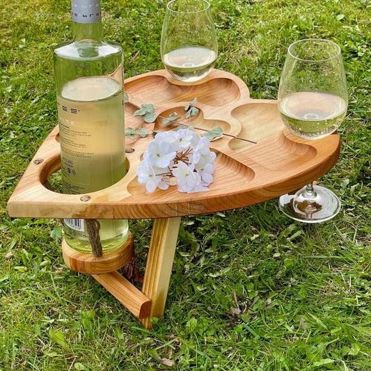 Herzförmiger Weintisch aus Kirschbaumholz – Klappbarer Picknicktisch & Serviertablett für Zwei