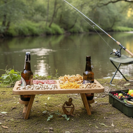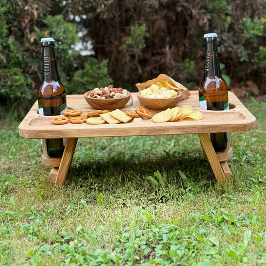 Klappbarer Biertisch, Campingtisch aus Eichenholz – mit Flaschenhaltern, Snackfächern – Frühstückstisch, Serviertablett, Geschenk für Männer.