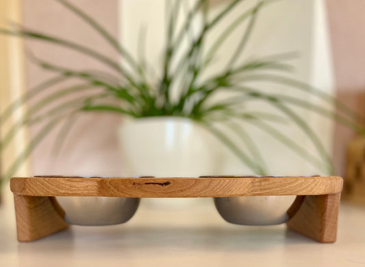 Personalisierte Futterstation für Katzen – Massivholz-Futterbar mit 2 Edelstahlnäpfen