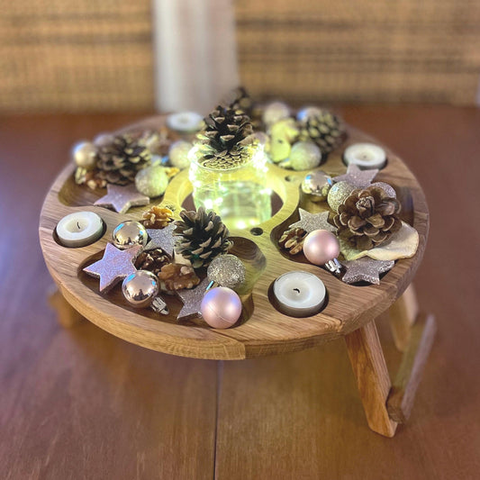 Kreativer Adventskranz aus Eichenholz – Klappbarer Holztisch & Serviertablett für Ihre Weihnachtsdekoration