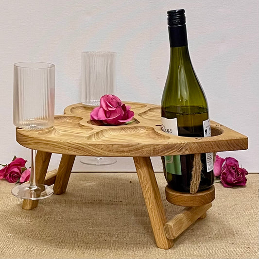 Personalisierter Weintisch in Herzform aus Eichenholz – Klappbarer Picknicktisch für Zwei