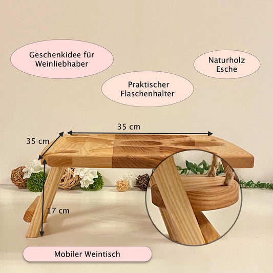 Personalisierter Weintisch aus Eichenholz – Klappbarer Picknicktisch & Couchbar mit Flaschenhalter