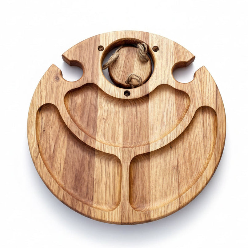 Dieser elegante, klappbare Weintisch aus hochwertigem Eichenholz ist der ideale Begleiter für Picknicks, Campingausflüge, Geburtstagsfeiern oder Hochzeiten. Mit Platz für eine Weinflasche, zwei Weingläser und drei zusätzlichen Snackfächern wird jede Weinverkostung zu einem luxuriösen Erlebnis. Die hängende Halterung präsentiert Ihre Weinflasche stilvoll und sorgt für Stabilität. Dank der optionalen Gravur wird dieser Tisch zu einem einzigartigen Geschenk für Weinliebhaber.