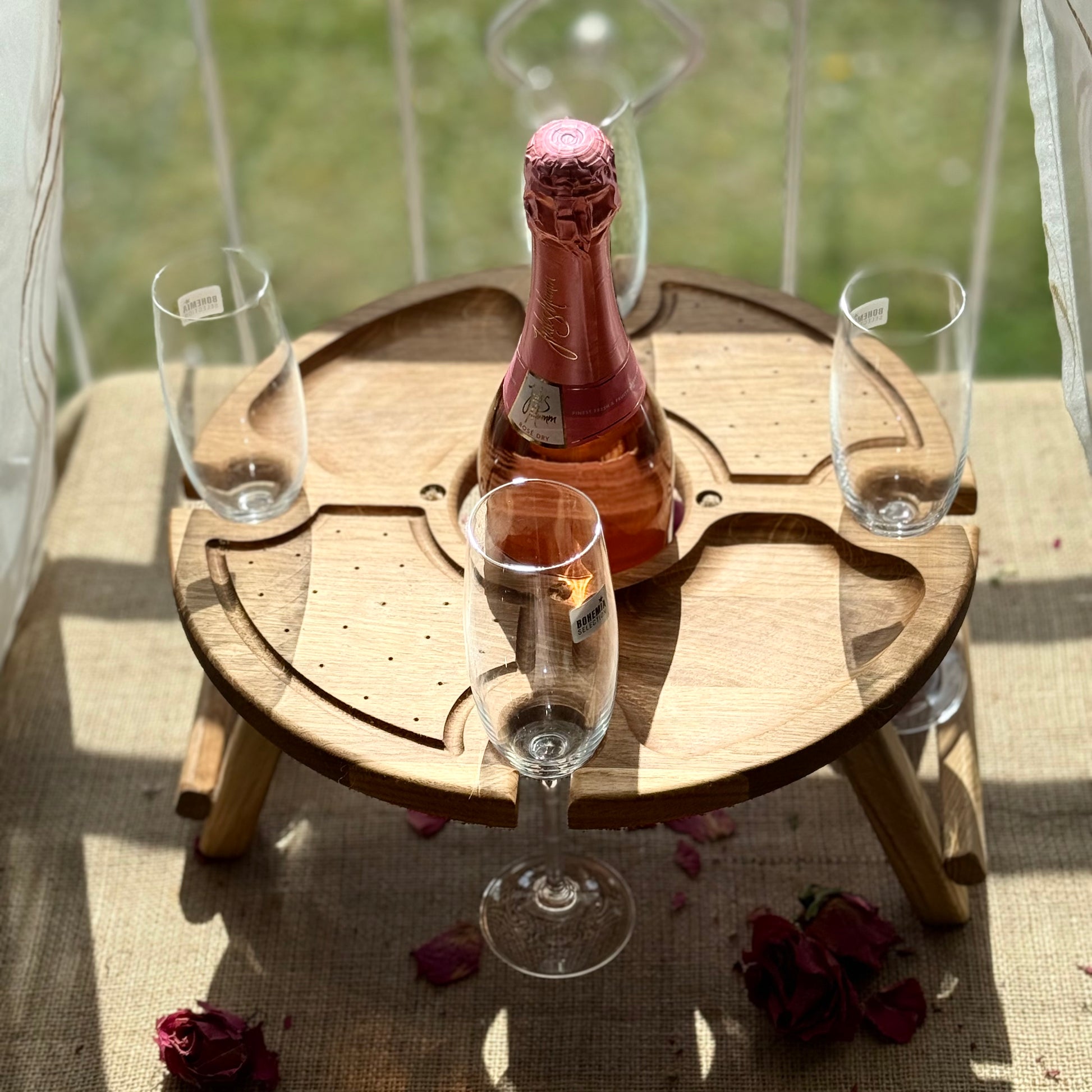 Dieser handgefertigte Weintisch aus hochwertigem Eichenholz vereint Funktionalität mit elegantem Design und ist der ideale Begleiter für gesellige Abende, ob im Wohnzimmer, auf der Terrasse oder beim Picknick.